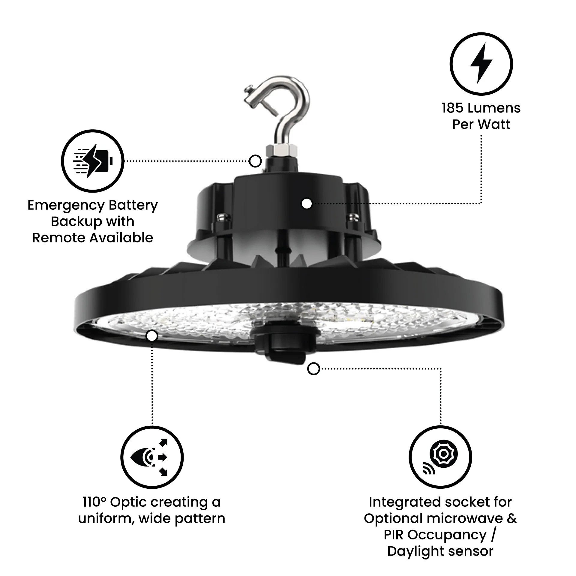 Saturn LED UFO High Bay, 100 watt, 120-277V, 18,500 Lumens, 5000K CCT, Black Finish